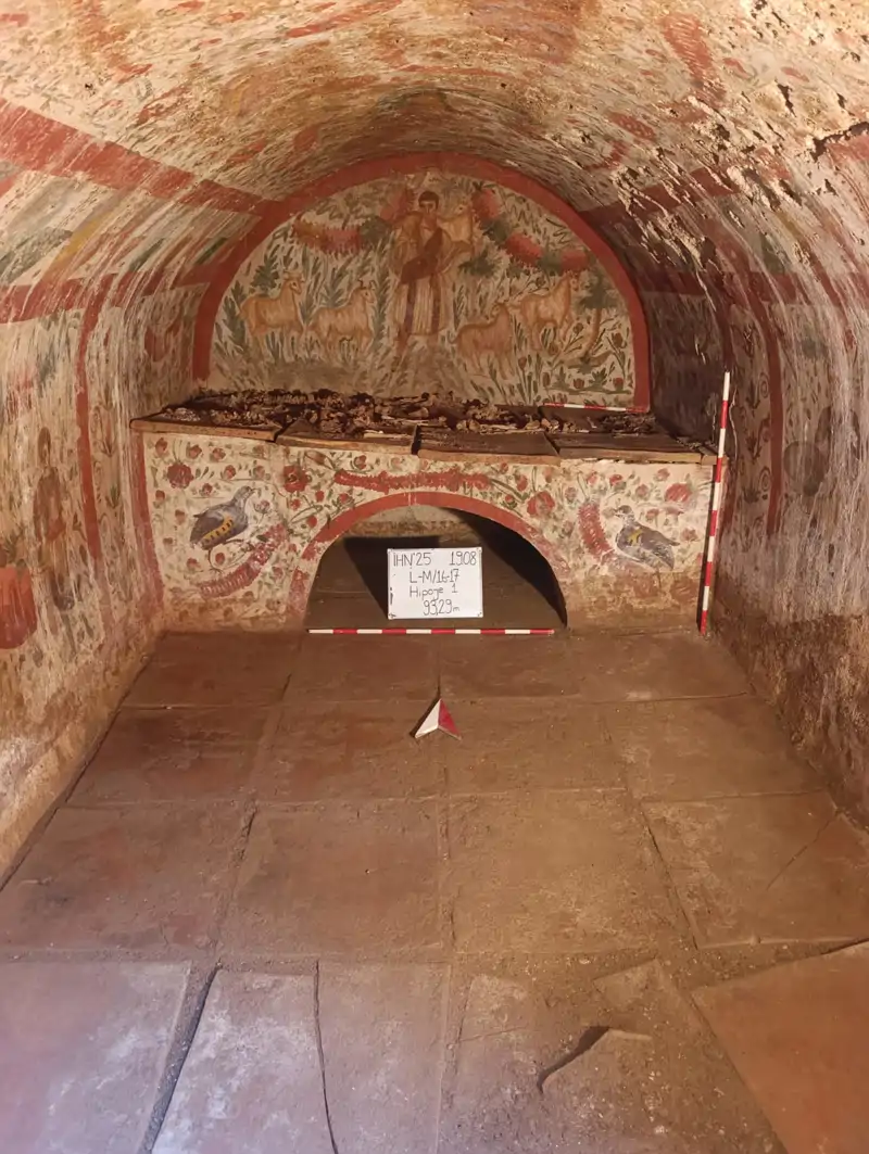 En este contexto, la tumba hipogeo recién descubierta resulta aún más extraordinaria. Sus paredes este, oeste y norte se mantienen casi intactas y conservan un conjunto de frescos que sobresale por su calidad y contenido. A diferencia de otros ejemplos regionales, aquí aparecen figuras humanas que ofrecen una ventana única a las creencias y aspiraciones espirituales de quienes descansaron en ella. La estructura interna revela, además, detalles sobre el ritual funerario. La klinē —el lecho funerario— adosada al muro norte estaba recubierta con losas cuadradas de arcilla cocina. Sobre ellas se depositaban los cuerpos, un gesto que combinaba tradición local con influencias mediterráneas más amplias. Allí, justo detrás de la klinē, una figura emerge del pasado con una fuerza sorprendente.