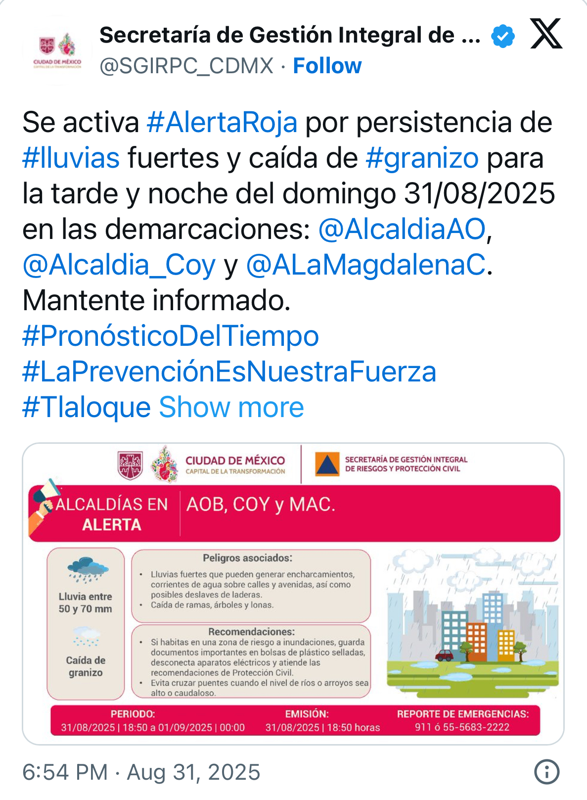 La alerta se activó el pasado domingo 31 de agosto, fuertes lluvias y caída de granizo, alertó a la Secretaría de Gestión Integral de Riesgos y Protección Civil, se activó la Alerta Roja en la Ciudad de México. Durante la noche del día  domingo hubieron lluvias, granizo y rayos en las alcaldías de la CDMX.